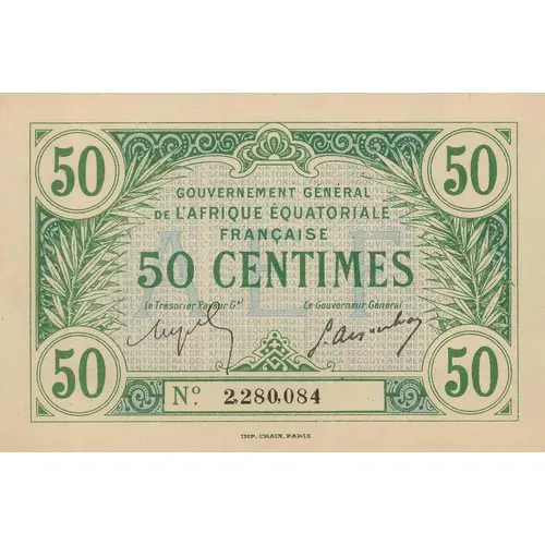 | 正面铭文 | GOUVERNEMENT GÉNÉRAL DE L`AFRIQUE EQUATORIALE FRANÇAISE 50 CENTIMES IMP. CHAIX. PARIS (Translation: General Government of French Equatorial Africa 50 centimes) |