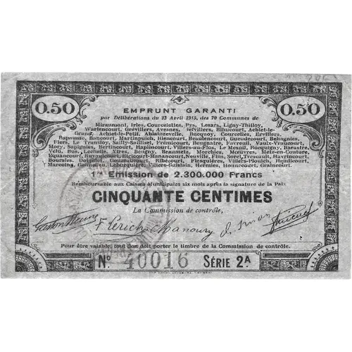 0,50 | 0,50 EMPRUNT GARANTI par Délibération du 23 Avril 1915, des 70 Communes de Miramont, Irles, Courcelettes, Pys, Lesars, Ligny-Thilloy, Warlencourt, Grévilliers, Avesnes, Lefvilliers, Bihucourt, Achiet-le-Grand, Achiet-le-Petit, Ablainzevelle, Bucquoy, Coucelles, Ervilliers, Bapaume, Bancourt, Martinpuich, Riencourt, Beaulencourt, Gueudecourt, Behagnies, Flers, Le Transloy, Sailly-Saillisel, Frémicourt, Beugnatre, Favreuil, Vaulx-Vraucourt,Mory, Sapignies, Bertincourt, Halincourt, Villiers-au-Flos, Le Mesnil, Rocquigny, Barastre, Vélu, Bus, Lechalles, Ibras, Beugny, Beaumetz, Morchies, Moevres, Metz-en-Couture, Equancourt, Bayaucourt, Etricourt-Manancourt, Neuville, Fins, Sorel, Trescault, Havrincourt, Boursies, Delgifies, Gouzeaucourt, Ribecourt, Flesquières, Villers-Plouich, Heudicourt, Marcoing, Gonnenelieu, Lebucquière, Villers-Guislain, Hermies, Honnecourt, Graincourt. 1ere Émission de 2.300.000 Francs remboursables aux Caisses Municipales six mois après signature de la Paix. CINQUANTE CENTIMES La Commission de contrôle, Pour être valable, tout bon doit porté le timbre de la Commission de contrôle. N° 40016 Série 2A IMP HENRY LEFEBVRE CAMBRAI |