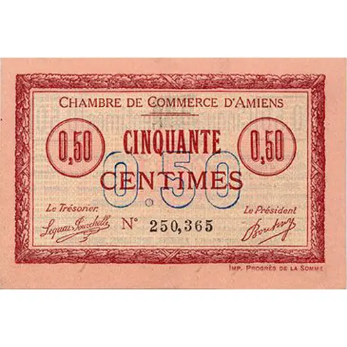 CHAMBRE DE COMMERCE D`AMIENS 0,50 | CINQUANTES | 0,50 CENTIMES Le Trésorier Le 1er Vice-Président N° 250,365 IMP, PROGRES DE LA SOMME |