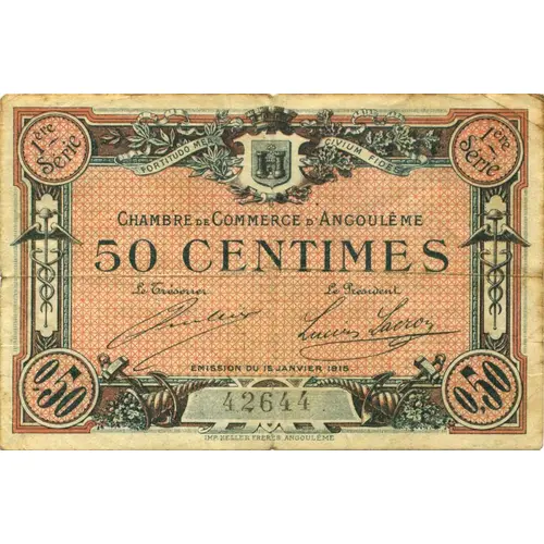 1ére Série 1ére Série FORTITUDO MEA CIVIUM FIDES CHAMBRE DE COMMERCE D`ANGOULÊME 50 CENTIMES Le Trésorier Le Président EMISSION DU 1ER JANVIER 1915. 0,50 42644 0,50 IMP. KELLER FRÈRES, ANGOULÊME |
