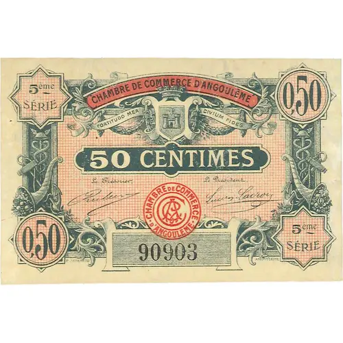 5ème série | 0.50 CHAMBRE DE COMMERCE D`ANGOULEME CHAMBRE DE COMMERCE D`ANGOULEME FORTITUDO MER CIVIUM FIDES 50 CENTIMES Le Trésorier Le Président 0,50 | 5ème série F. JAVANAUD ANGOULÊME |