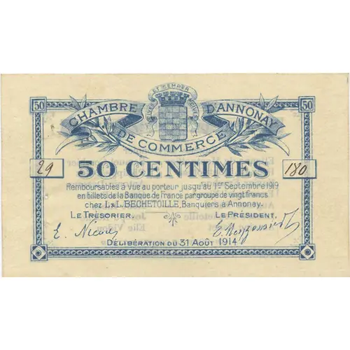 CHAMBRE DE COMMERCE D`ANNONAY CIVES ET SEMPER CIVES 50 CENTIMES Remboursable à vue au porteur jusqu`au 1er Septembre 1919 en billets de la Banque de France par groupe de vingt francs chez L&I BECHETOILE, banquier à Annonay. DELIBERATION DU 31 AOUT 1914 |
