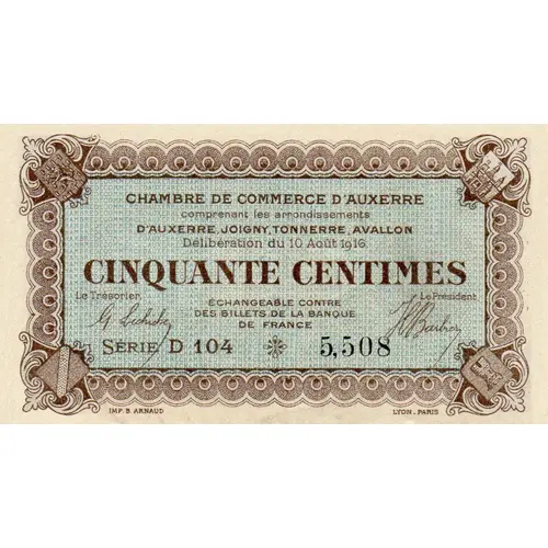 CHAMBRE DE COMMERCE D`AUXERRE comprenant les arrondissements D`AUXERRE, JOIGNY, TONNERRE, AVALLON Délibération du 10 Aout 1916 CINQUANTE CENTIMES Le Trésorier | Le Président ECHANGEABLE CONTRE DES BILLETS DE LA BANQUE DE FRANCE SERIE IMP.B.ARNAUD | LYON - PARIS |