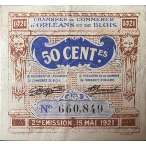 | Obverse lettering | CHAMBRES DE COMMERCE D`ORLÉANS ET DE BLOIS 50 CENT.ES LE PRÉSIDENT DE LA CHAMBRE DE COMMERCE DE BLOIS LE PRÉSIDENT DE LA CHAMBRE DE COMMERCE D`ORLÉANS 2me EMISSION 15 mai 1921 IMP. DU LOIRET ORLEANS |