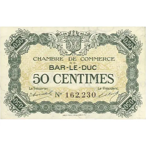| Obverse lettering | 0,50 0,50 CHAMBRE DE COMMERCE DE BAR-LE-DUC 50 CENTIMES Le Trésorier Le Président Nº25,410 0,50 0,50 NANCY-PARIS _ BERGER-LEVRAULT |