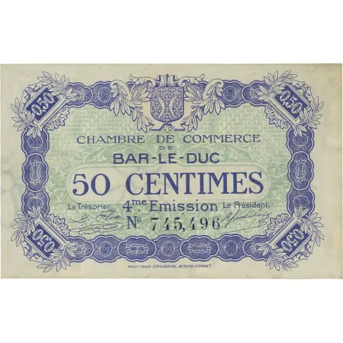 | Obverse lettering | 0,50 0,50 0,50 0,50 CHAMBRE DE COMMERCE DE BAR-LE-DUC 50 CENTIMES Le Trésorier 4me Emission Le Président N° 745,496 NANCY-PARIS-STRASBOURG_BERGER-LEVRAULT. |