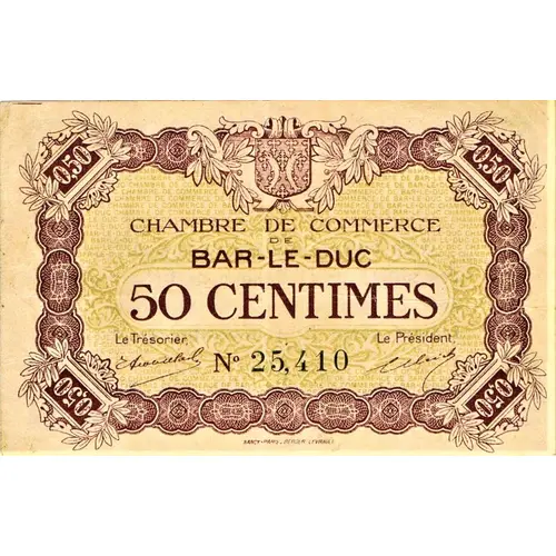 | Obverse lettering | 0,50 0,50 CHAMBRE DE COMMERCE DE BAR-LE-DUC 50 CENTIMES Le Trésorier Le Président Nº25,410 0,50 0,50 NANCY-PARIS _ BERGER-LEVRAULT |