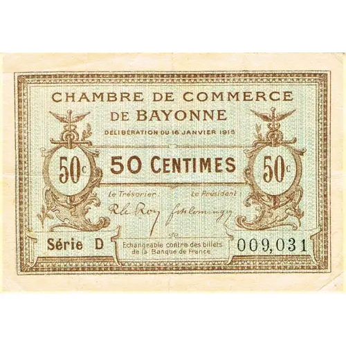 | Obverse lettering | CHAMBRE DE COMMERCE DE BAYONNE DELIBERATION DU 16 JANVIER 1915 50 CENTIMES Le Trésorier Le Président Série D 009,031 Echangeable contre des billets de la Banque de France |