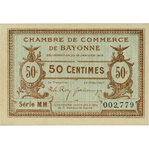 | Obverse lettering | CHAMBRE DE COMMERCE DE BAYONNE DELIBERATION DU 19 MAI 1917 50 CENTIMES Le Trésorier Le Président Série [---] [---,---] |