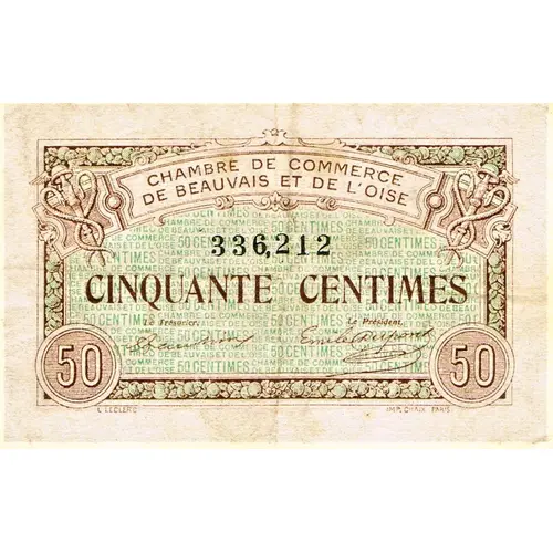 | Obverse lettering | CHAMBRE DE COMMERCE DE BEAUVAIS ET DE L`OISE 336,212 CINQUANTE CENTIMES Le Trésorier Le Président L. LECLERC IMP.CHAIX PARIS |