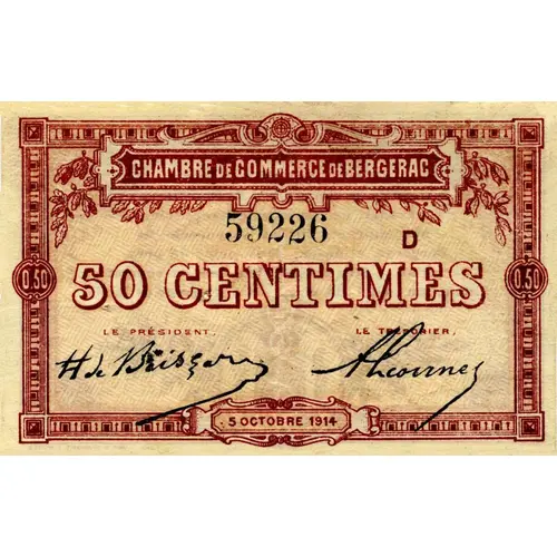 | Obverse lettering | CHAMBRE DE COMMERCE DE BERGERAC 0,5 | 50 CENTIMES | 0,50 Le PRESIDENT | LE TRESORIER 5 OCTOBRE 1914 |