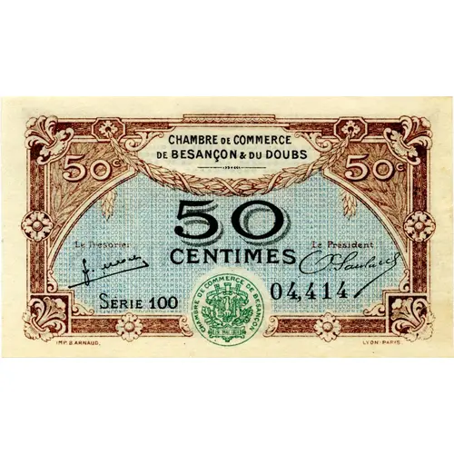 | Obverse lettering | CHAMBRE DE COMMERCE DE BESANÇON & DU DOUBS 50 CENTIMES Le Trésorier LePrésident SERIE 100 04,414 IMP B.ARNAUD LYON-PARIS |