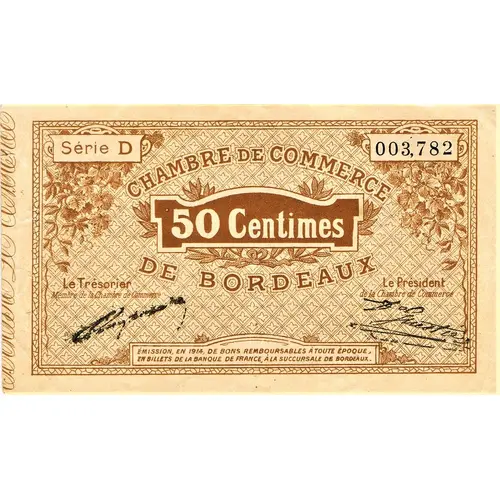 | Obverse lettering | Série D 003,782 CHAMBRE DE COMMERCE 50 CENTIMES DE BORDEAUX Le Trésorier MEMBRE DE LA CHAMBRE DE COMMERCE Le Président DE LA CHAMBRE DE COMMERCE Émission, en 1914, de bons remboursables à toute époque, en billets de la Banque de France à la succursale de Bordeaux. |