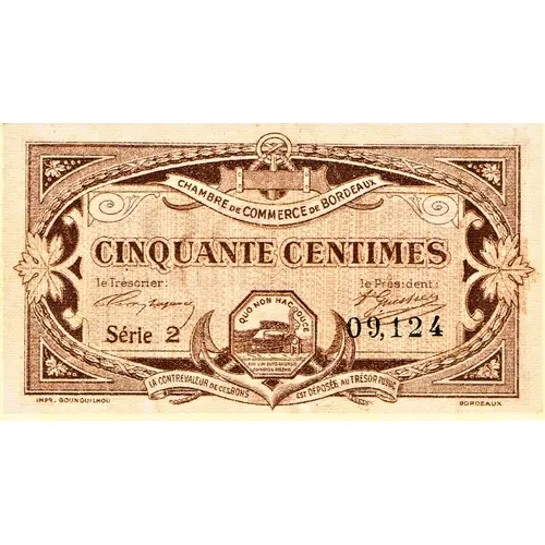 | Obverse lettering | CHAMBRE DE COMMERCE DE BORDEAUX CINQUANTE CENTIMES Le Trésorier Le Président Série 2 09,124 QUO NON HAC DUCE XXI VIRI BURDIGALENSES COMMERCIS REGENDI LA CONTREVALEUR DE CES BONS EST DÉPOSÉE AU TRÉSOR PUBLIQUE IMPG. GOUNOUILHOU BORDEAUX |