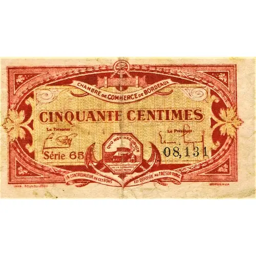 | Obverse lettering | CHAMBRE DE COMMERCE DE BORDEAUX CINQUANTE CENTIMES Le Trésorier Le Président Série 65 08,131 IMP. GOUNOUILHOU BORDEAUX |