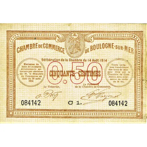 | Obverse lettering | CHAMBRE DE COMMERCE DE BOULOGNE-SUR-MER Délibération de la Chambre du 14 Août 1914 CINQUANTE CENTIMES Le Trésorier Le Président de la Chambre de Commerce 084142 C 1. 084142 |