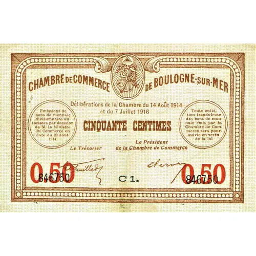 | Obverse lettering | CHAMBRE DE COMMERCE DE BOULOGNE-SUR-MER Délibération de la Chambre du 14 Août 1914 et du 7 Juillet 1916 CINQUANTE CENTIMES Le Trésorier Le Président de la Chambre de Commerce 0,50 C1 0,50 |