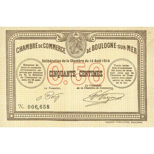 | Obverse lettering | CHAMBRE DE COMMERCE DE BOULOGNE-SUR-MER Délibération de la Chambre du 14 Août 1914 0.50 CINQUANTE CENTIMES Le Trésorier Le Président de la Chambre de Commerce 006,558 |