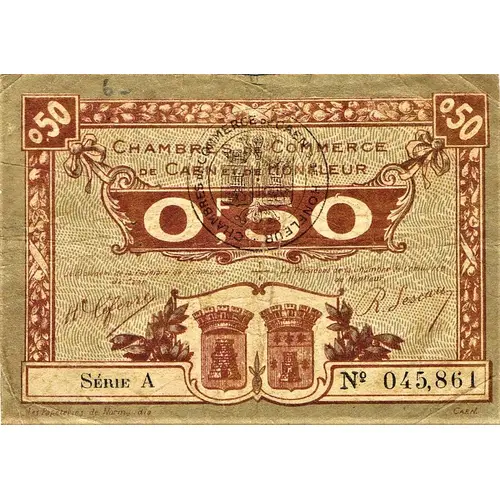 | Obverse lettering | CHAMBRE DE COMMERCE DE CAEN ET DE HONFLEUR 0F, 50 Série A N°045,861 Les papeteries de Normandie Caen |