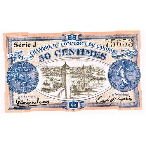 | Opis líce | Série J 75653 INDUSTRIE CHAMBRE DE COMMERCE DE CAHORS AGRICULTURE 50 CENTIMES Le Trésorier Le Président |