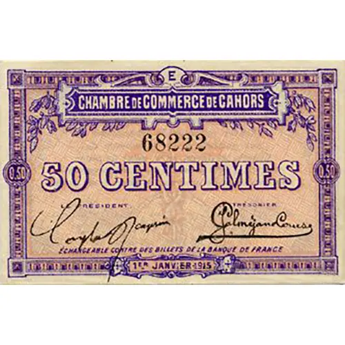 | Opis líce | CHAMBRE DE COMMERCE DE CAHORS 68222 0.50 50 CENTIMES LE PRESIDENT LE TRESORIER ECHANGEABLE CONTRE DES BILLETS DE LA BANQUE DE FRANCE 1ER JANVIER 1915 |