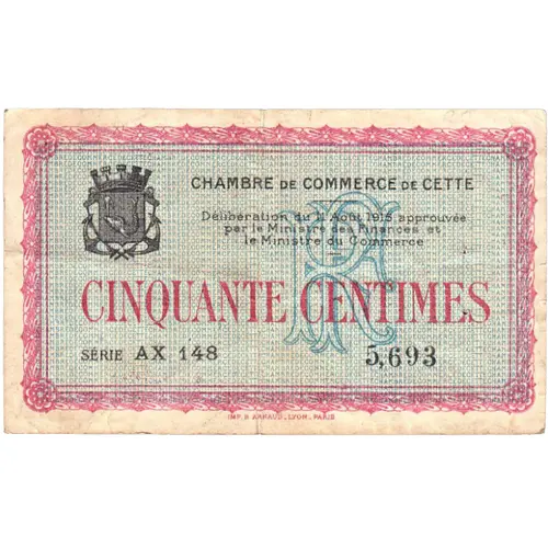 CHAMBRE DE COMMERCE DE CETTE DELIBERATION DU 11 AOUT 1915 APPROUVEE PAR LE MINISTRE DES FINANCES ET LE MINISTRE DU COMMERCE CINQUANTES CENTIMES SERIE AX 148 5,693 IMP B ARNAUD _ LYON _ PARIS |