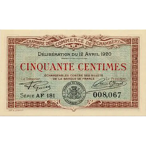 | Obverse lettering | CHAMBRE DE COMMERCE DE CHAMBÉRY CINQUANTE CENTIMES ÉCHANGEABLES CONTRE DES BILLETS DE LA BANQUE DE FRANCE Le Trésorier Le Président CHAMBRE DE COMMERCE DE CHAMBÉRY SÉRIE AF 181 008,067 IMP B.ARNAUD _LYON_PARIS |