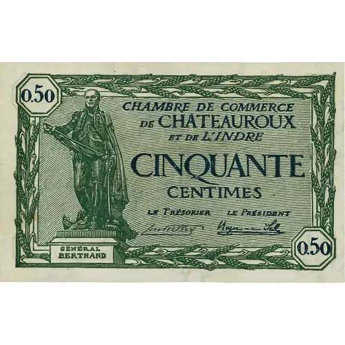 | Obverse lettering | 0.50 CHAMBRE DE COMMERCE DE CHATEAUROUX ET DE l`INDRE CINQUANTE CENTIMES Le Trésorier Le Président GENERAL BERTRAND |