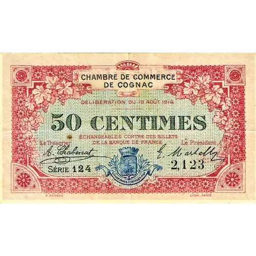 | Ön yüz lejandı | CHAMBRE DE COMMERCE DE COGNAC Délibération du 19 août 1916 50 CENTIMES Echangeables contre des billets de la Banque de France Le Trésorier Le Président SERIE 124 2,123 B.ARNAUD LYON - PARIS |