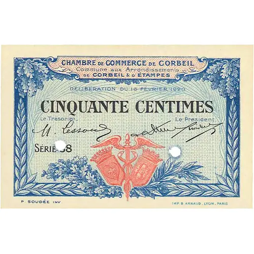 | Vorderseitenlegende | CHAMBRE DE COMMERCE DE CORBEIL Commune aux Arrondissements de Corbeil & d`Etampes DELIBERATION DU 16 FEVRIER 1920 CINQUANTE CENTIMES Le Trésorier Le Président SERIE 38 P. SOUDÉE INV. IMP. B.ARNAUD LYON_PARIS |