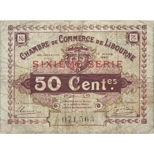 Obverse description LIBOURNE CHAMBER OF COMMERCE DELIBERATION OF MARCH 12, 1920 SIXTH SERIES 50 cent. Redeemable in bills of the Banque de France until the end of December 1925 Treasurer The President (n°) 071,563