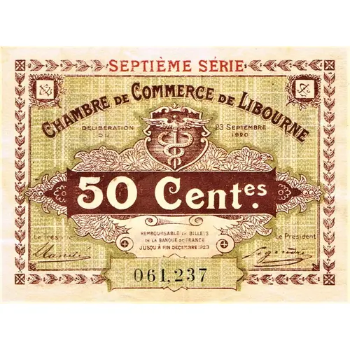 | Obverse lettering | SEPTIEME SERIE CHAMBRE DE COMMERCE DE LIBOURNE Délibération du 23 septembre 1920 50 CENTes. Remboursable en billets de la Banque de France jusqu`à fin décembre 1923. Le trésorier Le Président 061,237 |
