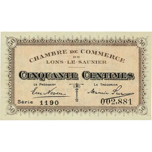 | Obverse lettering | CHAMBRE DE COMMERCE DE LONS-LE-SAUNIER Le Président Le Trésorier Série 1190 002,881 |