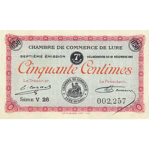 0.50f 0.50f CHAMBRE DE COMMERCE DE LURE SEPTIÈME ÉMISSION 7E ÉMISSION DÉLIBÉRATION DU 12 DÉCEMBRE 1921 Cinquante Centimes Le Trésorier Le Président CHAMBRE DE COMMERCE LURE (HTE SAÔNE) SERIE V 26 002,257 IMP. B.ARNAUD _ LYON - PARIS |