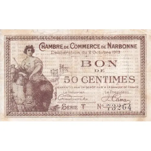 | Descrizione del dritto | Narbonne Chamber of Commerce 50 centimes Deliberation: October 2, 1919 Redemption deadline: October 2, 1924 With dry-stamp of the Chamber of Commerce Printer : IMP. BOUSQUET - NARBONNE Series Q, R, S, T Number with 5 digits Signatures: Treasurer - President letters C |