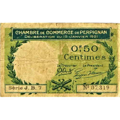 | Obverse lettering | CHAMBRE DE COMMERCE DE PERPIGNAN Délibération du 15 janvier 1921 0,50 Centimes Le Trésorier Le Président Série J. B. 7 N° 07,319 IMP P MORER - BENEZET, PERPIGNAN |