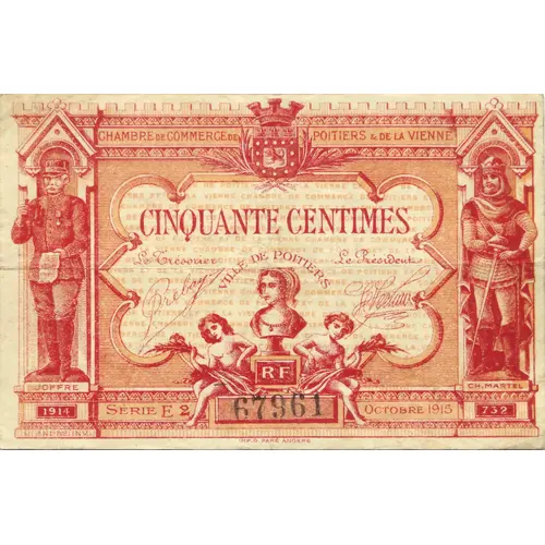 CHAMBRE DE COMMERCE DE POITIERS & DE LA VIENNE CINQUANTE CENTIMES Le Trésorier Le Président VILLES DE POITIERS RF JOFFRE CH.MARTEL 1914 732 L. ANDRÉ INV. IMP. G. PARÉ ANGERS |