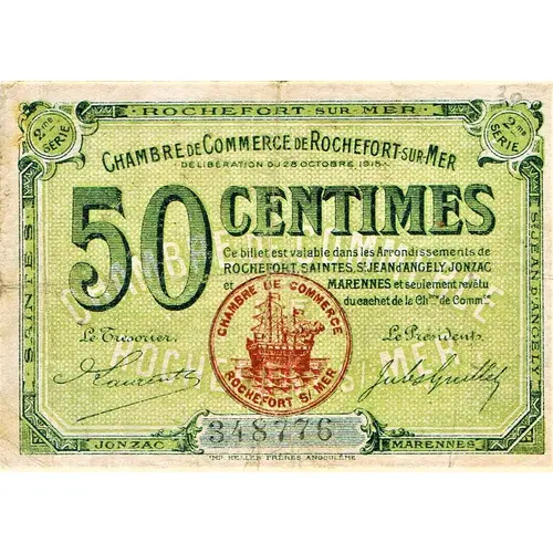| Obverse lettering | 2ème SERIE CHAMBRE DE COMMERCE DE ROCHEFORT-SUR-MER Délibération du 28 octobre 1915 50 CENTIMES Ce billet est valable dans les Arrondissements de ROCHEFORT, SAINTES, St JEAN D`ANGELY, JONZAC et MARENNES et seulement revêtu du cachet de la Chbre de Commce. Le Président 348776 JONZAC MARENNES IMP KELLER FRERES ANGOULÊME |
