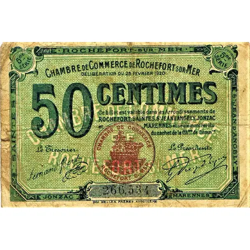 | Obverse lettering | 5ème SERIE CHAMBRE DE COMMERCE DE ROCHEFORT-SUR-MER Délibération du 25 février 1920 50 CENTIMES Le Trésorier Le Président 266,534 IMP KELLER FRÉRES ANGOULÊME |
