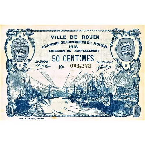 | Opschrift voorzijde | VILLE DE ROUEN CHAMBRE DE COMMERCE DE ROUEN 1918 Emission de remplacement 50 CENTIMES Le Maire Le Président n° 001,272 IMP. RICHARD, PARIS |