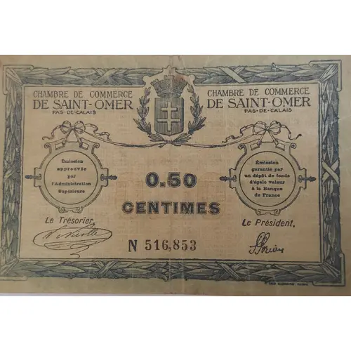 | Obverse lettering | CHAMBRE DE COMMERCE DE SAINT-OMER Pas-de-Calais 0.50 Centimes Le Trésorier Le Président N 516,853 IMP. RICHARD PARIS |