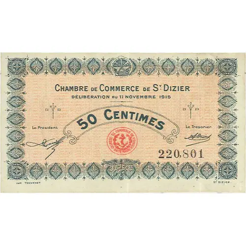 CHAMBRE DE COMMERCE DE ST DIZIER DÉLIBÉRATION DU 11 NOVEMBRE 1915 50 CENTIMES Le Président Le Trésorier CHAMBRE DE COMMERCE DE ST DIZIER HAUTE MARNE 220,801 IMP. THEVENOT ST DIZIER |