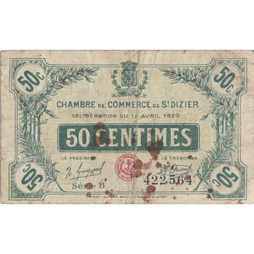 | 表面の銘文 | CHAMBRE DE COMMERCE DE ST DIZIER DÉLIBÉRATION DU 14 avril 1920 50 CENTIMES Le Président Le Trésorier |
