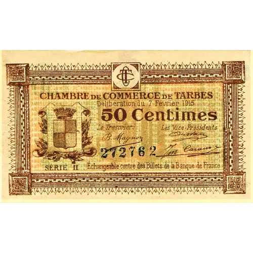 | Obverse lettering | CHAMBRE DE COMMERCE DE TARBES Délibération du 7 février 1915 50 Centimes Le trésorier Le Vice-Président SERIE II Echangeable contre des Billets de la Banque de France |