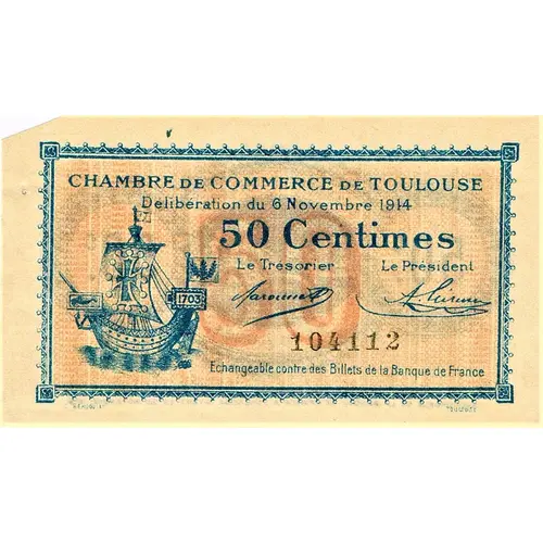 | Obverse lettering | CHAMBRE DE COMMERCE DE TOULOUSE Délibération du 6 Novembre 1914 50 Centimes Le Trésorier Le Président 1703 104112 Echangeable contre des Billets de la Banque de France C. Berdoulat TOULOUSE |