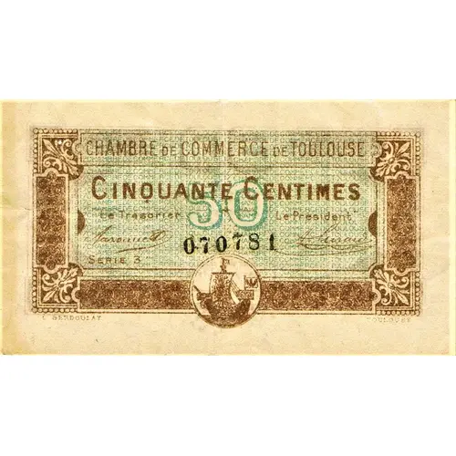 | Obverse lettering | CHAMBRE DE COMMERCE DE TOULOUSE CINQUANTE CENTIMES Le trésorier Le Président 070781 SERIE 3 C. BERDOULAT TOULOUSE |