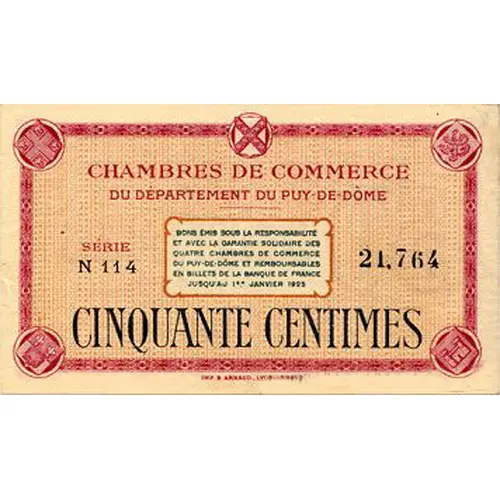 CHAMBRES DE COMMERCE DU DÉPARTEMENT DU PUY-DE-DÔME SÉRIE N 114 21,764 BONS ÉMIS SOUS LA RESPONSABILITÉ ET AVEC LA GARANTIE SOLIDAIRES DES QUATRE CHAMBRE DE COMMERCE DU PUY-DE-DÔME ET REMBOURSABLES EN BILLETS DE LA BANQUE DE FRANCE JUSQU`AU 1ER JANVIER 1925 CINQUANTE CENTIMES IMP B.ARNAUD _ LYON_PARIS |