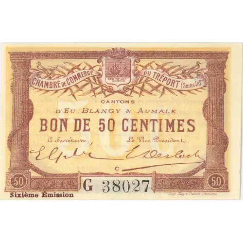 | Obverse lettering | CHAMBRE DE COMMERCE DU TREPORT (Seine Inf) CANTONS D`EU , BLANGY & AUMALE BON DE 50 CENTIMES Le Secrétaire Le Vice-Président C G 38027 Sixième Émission Imp. Roy & Valade Amiens |