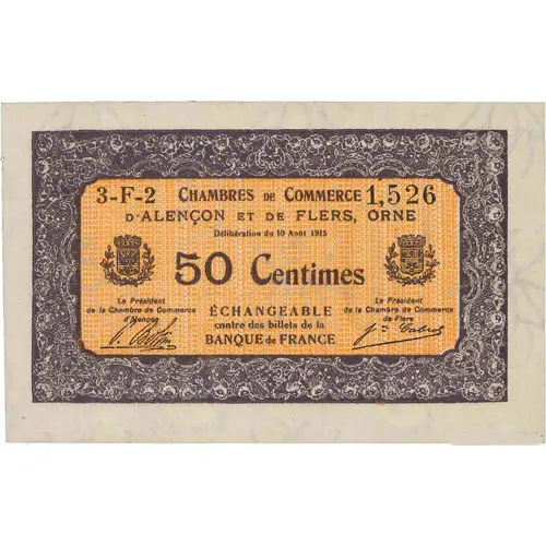 CHAMBRE DE COMMERCE D`ALENCON ET DE FLERS, ORNE 50 Centimes ECHANGEABLE contre des billets de la BANQUE de FRANCE |