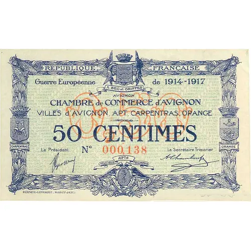 REPUBLIQUE FRANÇAISE Guerre Européenne de A BEC et GRIFFES AVIGNON CHAMBRE de COMMERCE d`AVIGNON VILLES d`AVIGNON, APT, CARPENTRAS, ORANGE 50 CENTIMES CARPENTRAS ORANGE Le Président, Le Secrétaire-Trésorier, N° 000,138 FELICIBUS APTA TRIUMPHIS BERGER-LEVRAULT NANCY-PARIS |